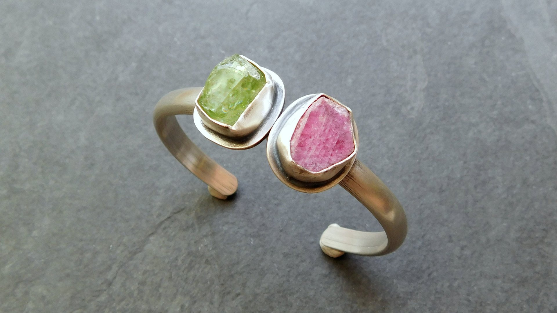 Raw Mineral Peridot Ruby Sterling Silver Bracelet, Pink Green Natural Crystal Jewelry